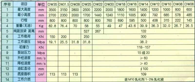 DW系列外注式單體液壓支柱,與金屬頂梁配合,供煤礦一般機械化采煤高檔工作面支護頂板用,也可供綜合機械化采煤工作端頭支護用,適用于煤層傾角小于25°的緩傾斜回采工作面。采取一定的安全措施,也可用于傾角25°—35°的回采工作面。工作介質采用含M10乳化油2%的乳化液。